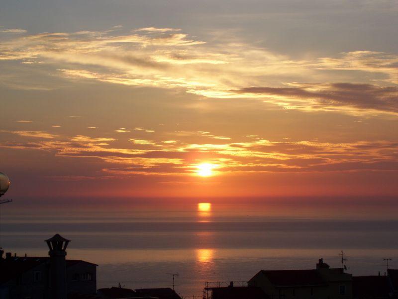 Grande terrazza di oltre 40mq con tettoia e superba vista mare fino a Nizza e Isole di Lérins, attrezzata con sedie, tavolo, ombrellone, sdraio, rostelliera e barbeque.