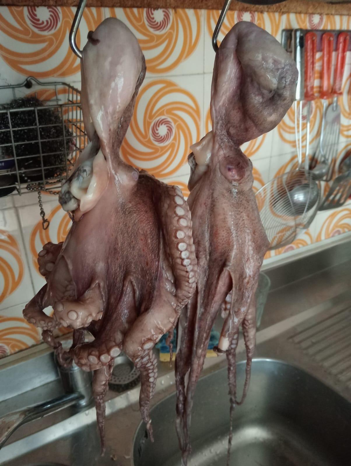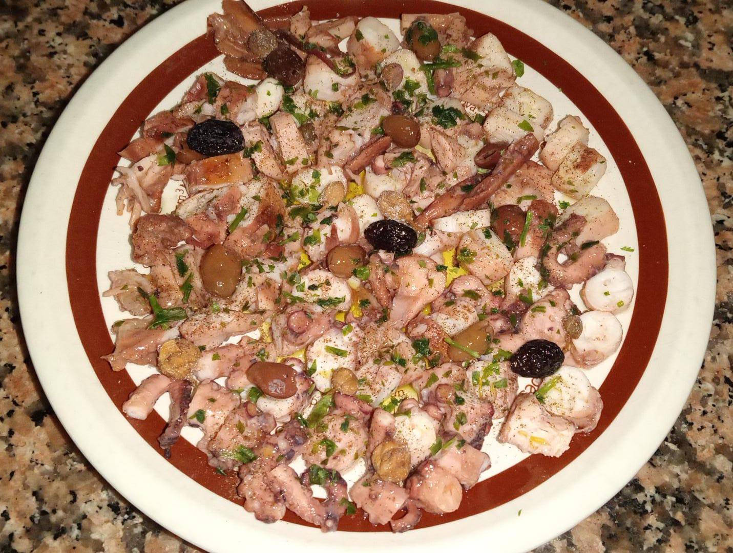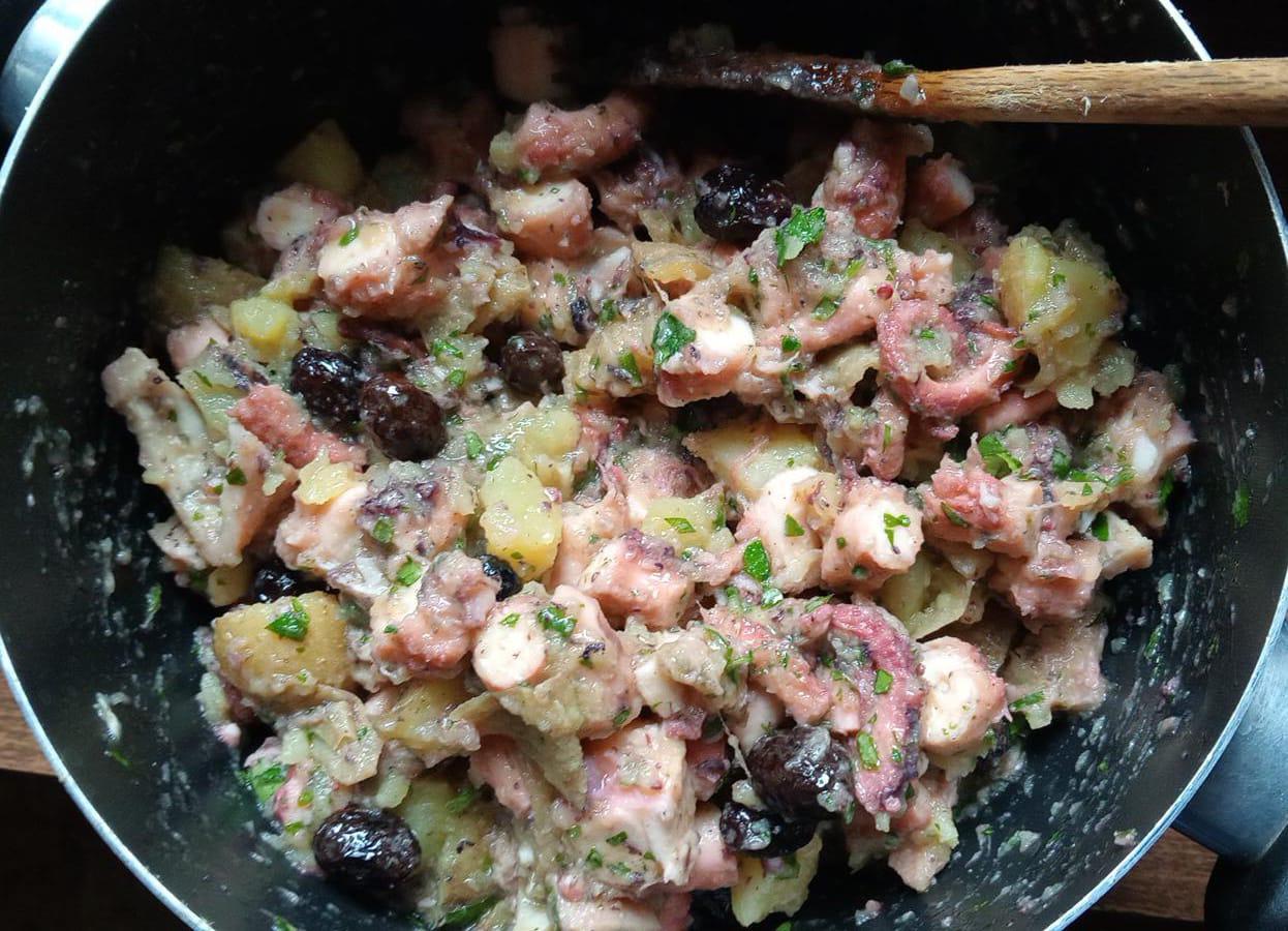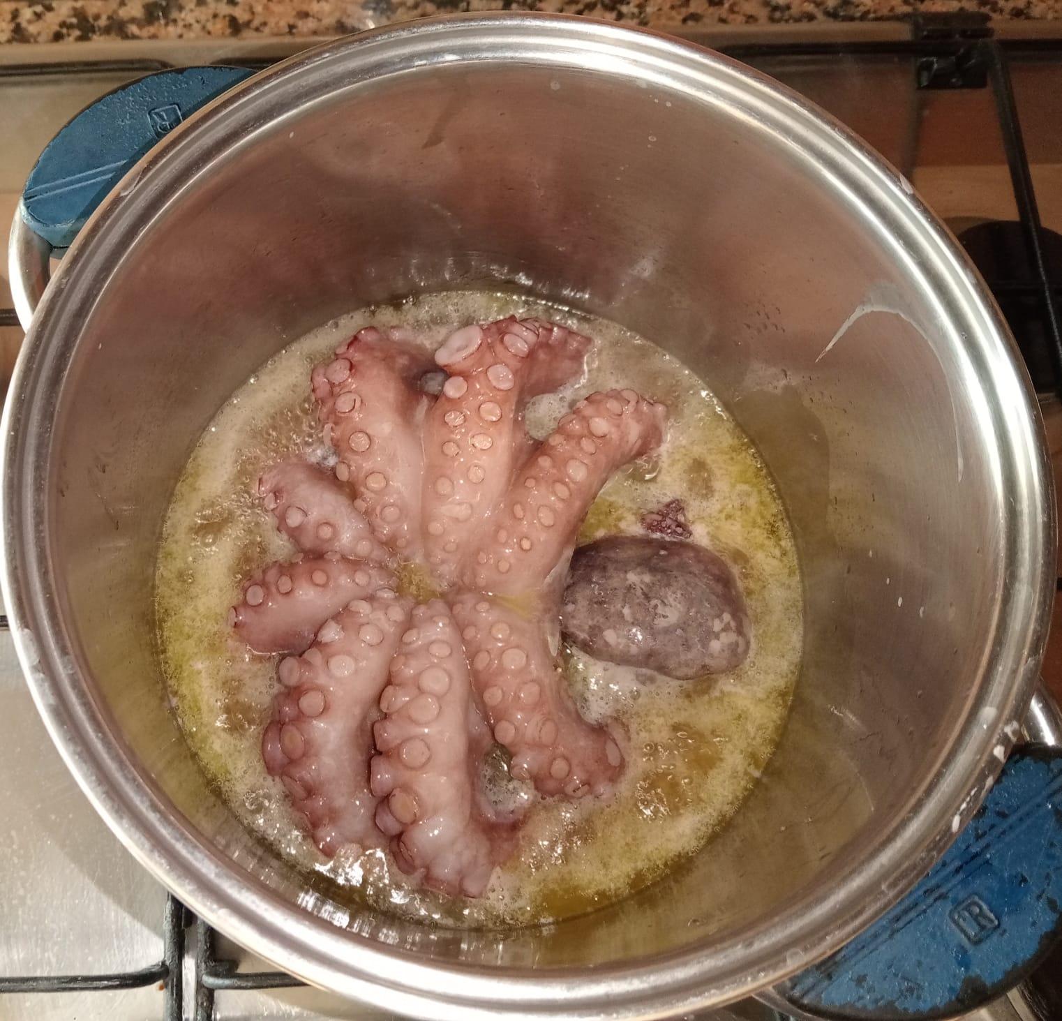 vino bianco, olio EVO in cottura,quindi condimento con prezzemolo, aglio, patate, olive taggiasche, pepe nero, olio EVO